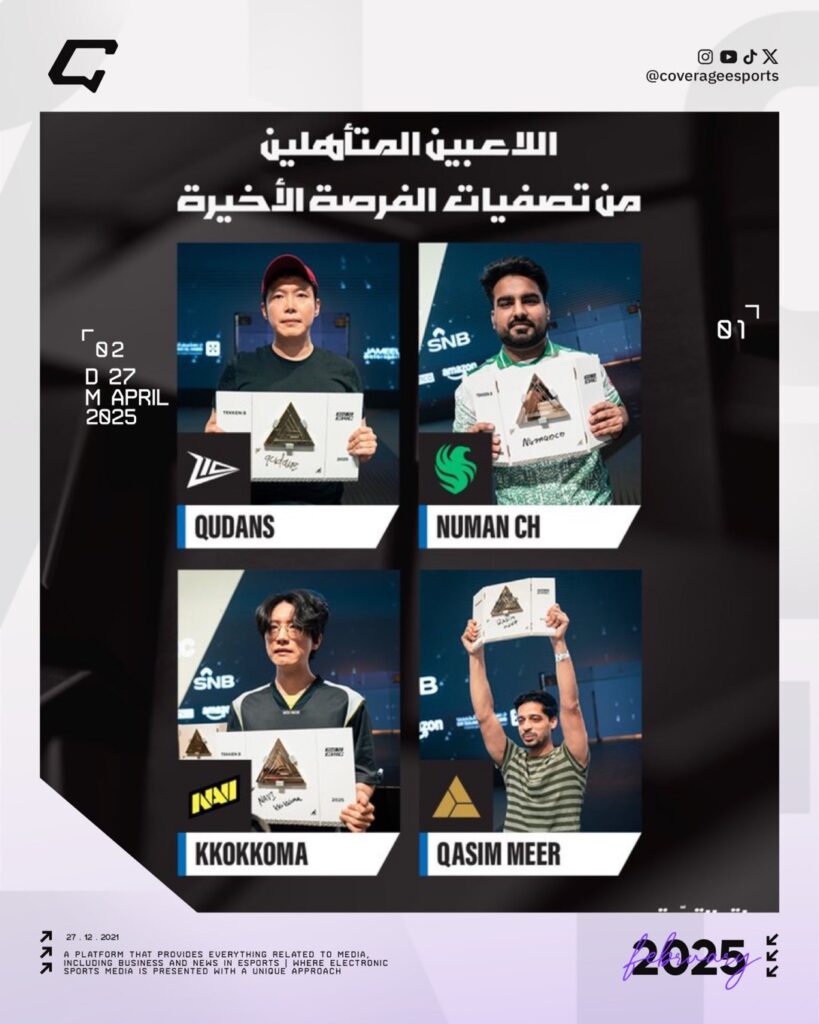 شاركها فيسبوك تويتر لينكدإن بينتيريست البريد الإلكتروني Copy Link إليكم اللاعبين المتأهلين من التصفيات الأخيرة المؤهلة لبطولة Tekken 8 ضمن منافسات كاس العالم للرياضات الالكترونية 2025. 🥋| @tk_numanch🥋| @qudans1987🥋| @QasimMeer3🥋| @kkokkoma_mujoy تهانيناً 🎉 EWC2025 TEKKEN 8 كاس العالم للرياضات الالكترونية 2025