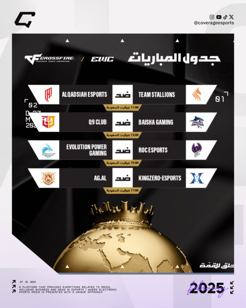 إليكم جدول مباريات اليوم الرابع من بطولة Crossfire ضمن منافسات #كاس_العالم_للرياضات_الالكترونية 2025، تنطلق اليوم الساعة الحادي عشر صباحاً بتوقيت السعودية