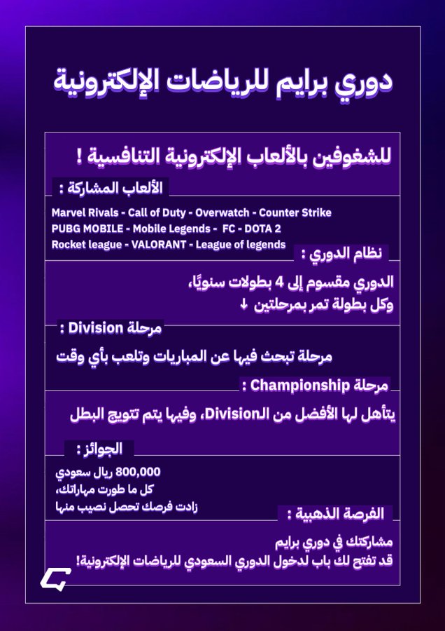 شاركها فيسبوك تويتر لينكدإن بينتيريست البريد الإلكتروني Copy Link إليكم تفاصيل دوري برايم للرياضات الإلكترونية 🎮 دوري برايم