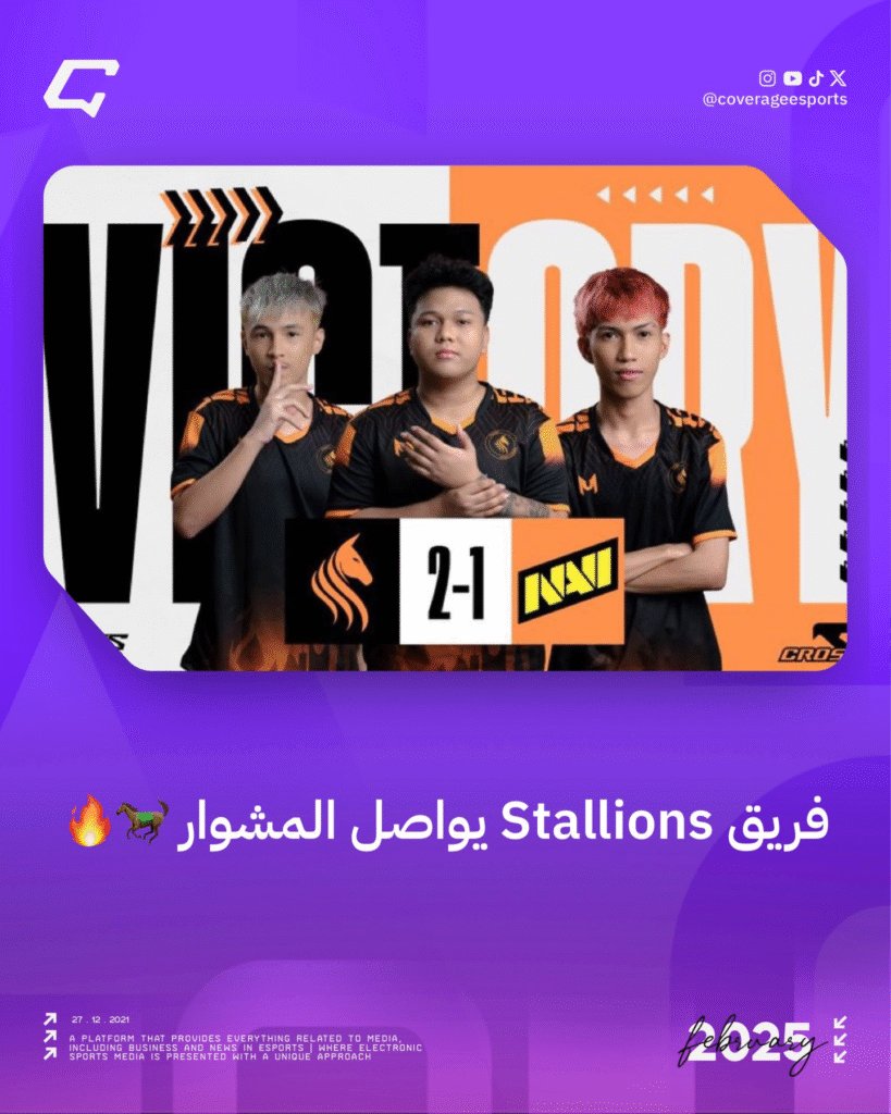 انتصر فريق Team Stallions على خصمه فريق NAVI بنتيجة 2-1 ليحجز بطاقة التأهل إلى الأدوار الإقصائية من مجموعة D في بطولة Crossfire ضمن منافسات #كاس_العالم_للرياضات_الالكترونية 2025.