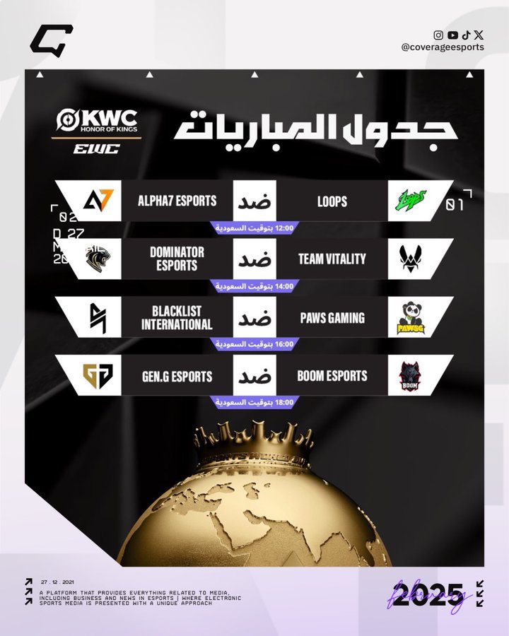 Share Facebook Twitter LinkedIn Pinterest Email Copy Link Here is the schedule for Day 1 of the Honor of Kings tournament at the 2025 eSports World Cup. EWC2025 Honor of Kings كاس العالم للرياضات الالكترونية 2025