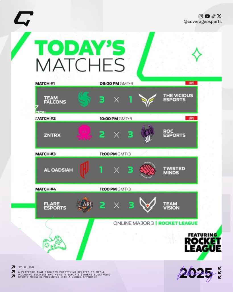 Share Facebook Twitter LinkedIn Pinterest Email Copy Link Here are the results of the fourth day of the online phase of Rocket League III in the Elite League ⚽️ AlQadisiahES Falcons flareEsport ROC Esports Rocket League The Vicious TwisMinds دوري النخبة نتائج مباريات
