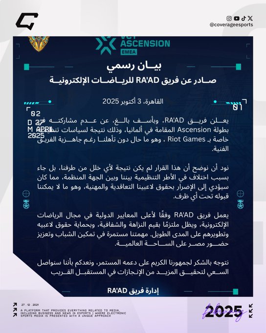 أصدر فريق RA’AD بيانًا رسميًا أعلن فيه عدم مشاركته في بطولة VCT Ascension EMEA المقامة في ألمانيا، وذلك رغم تأهله وجاهزية الفريق فنيًا. وأرجع النادي القرار إلى سياسات تنظيمية خاصة بـ Riot Games واختلاف في الأطر التنظيمية بين الطرفين.